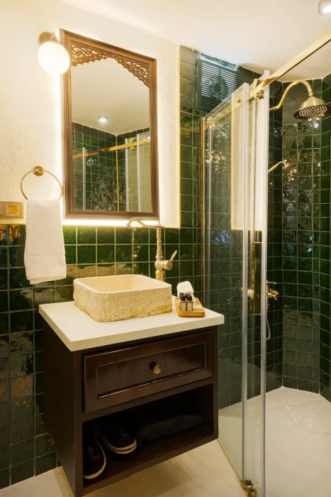 Günün yorgunluğunu atmanız için tasarlanan geniş ve konforlu yatağımız, şık başlığı ve kaliteli tekstil ürünleri ile deliksiz bir uyku vadediyor. Odanın her köşesinde hissedilen ince zevk, banyoda da kendini gösteriyor. Derin zümrüt yeşili fayansların, doğal taş lavabo ve vintage tarzdaki altın rengi armatürlerle oluşturduğu kontrast, banyo keyfinizi görsel bir şölene dönüştürüyor.