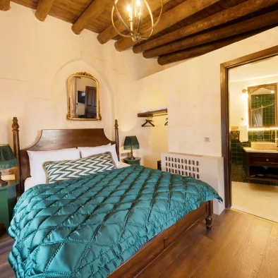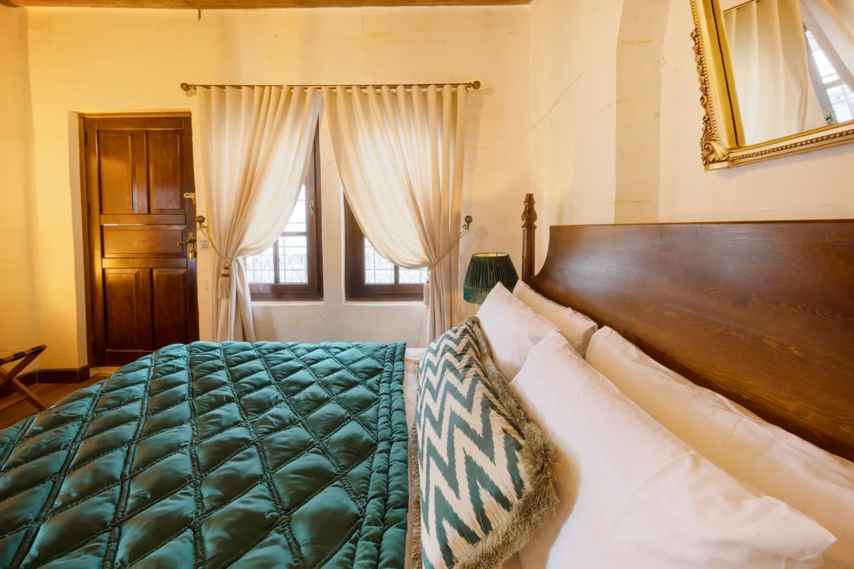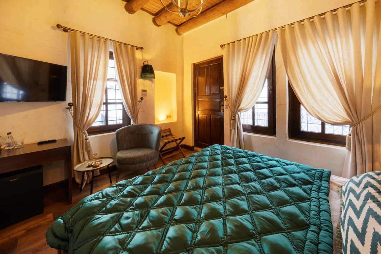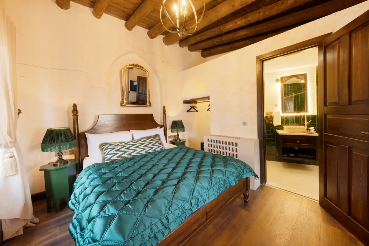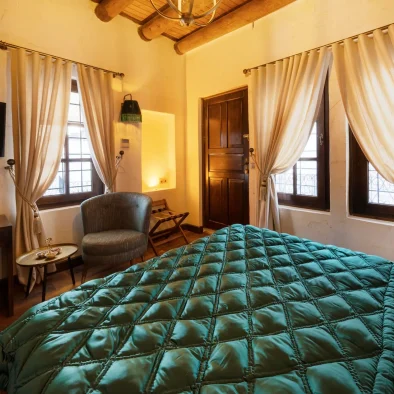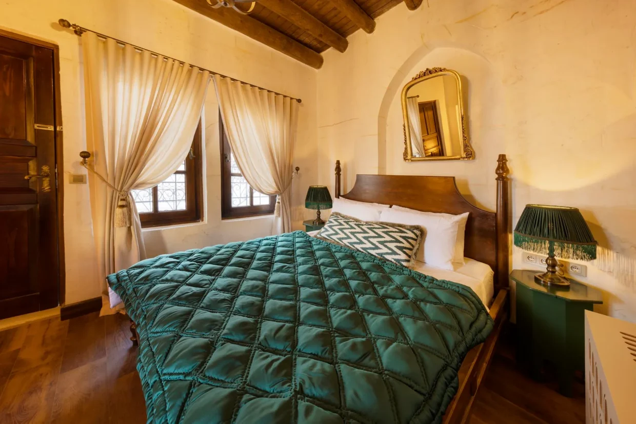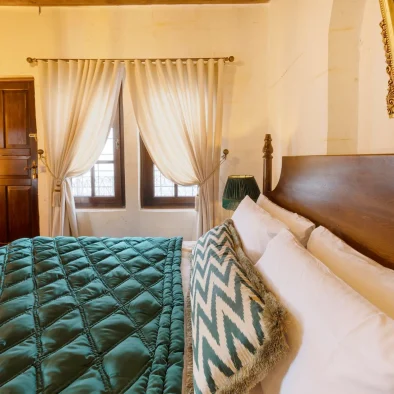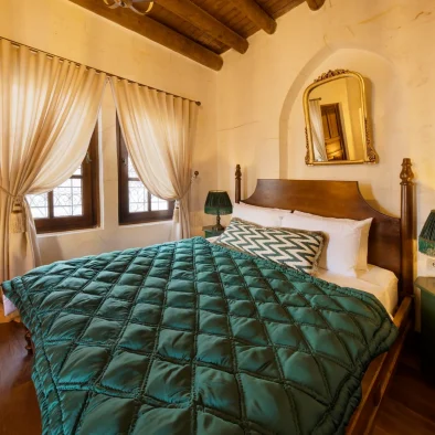 Zerzembe Otel’in özenle hazırlanmış 203 numaralı Deluxe Odası’nda, bölgenin mistik ruhunu modern lüksün ayrıcalıklarıyla yaşayın. Odaya adım attığınız anda sizi karşılayan otantik ahşap tavan kirişleri ve bölgeye özgü doğal taş duvarlar, serin ve huzurlu bir atmosfer yaratırken; zümrüt yeşili ve sıcak ahşap tonlarının hakim olduğu dekorasyon, konaklamanıza asil bir dokunuş katıyor.
