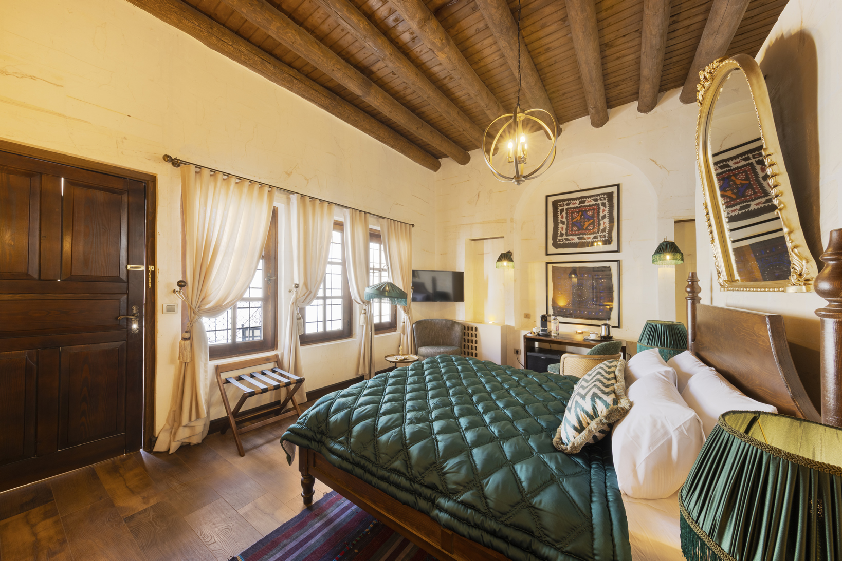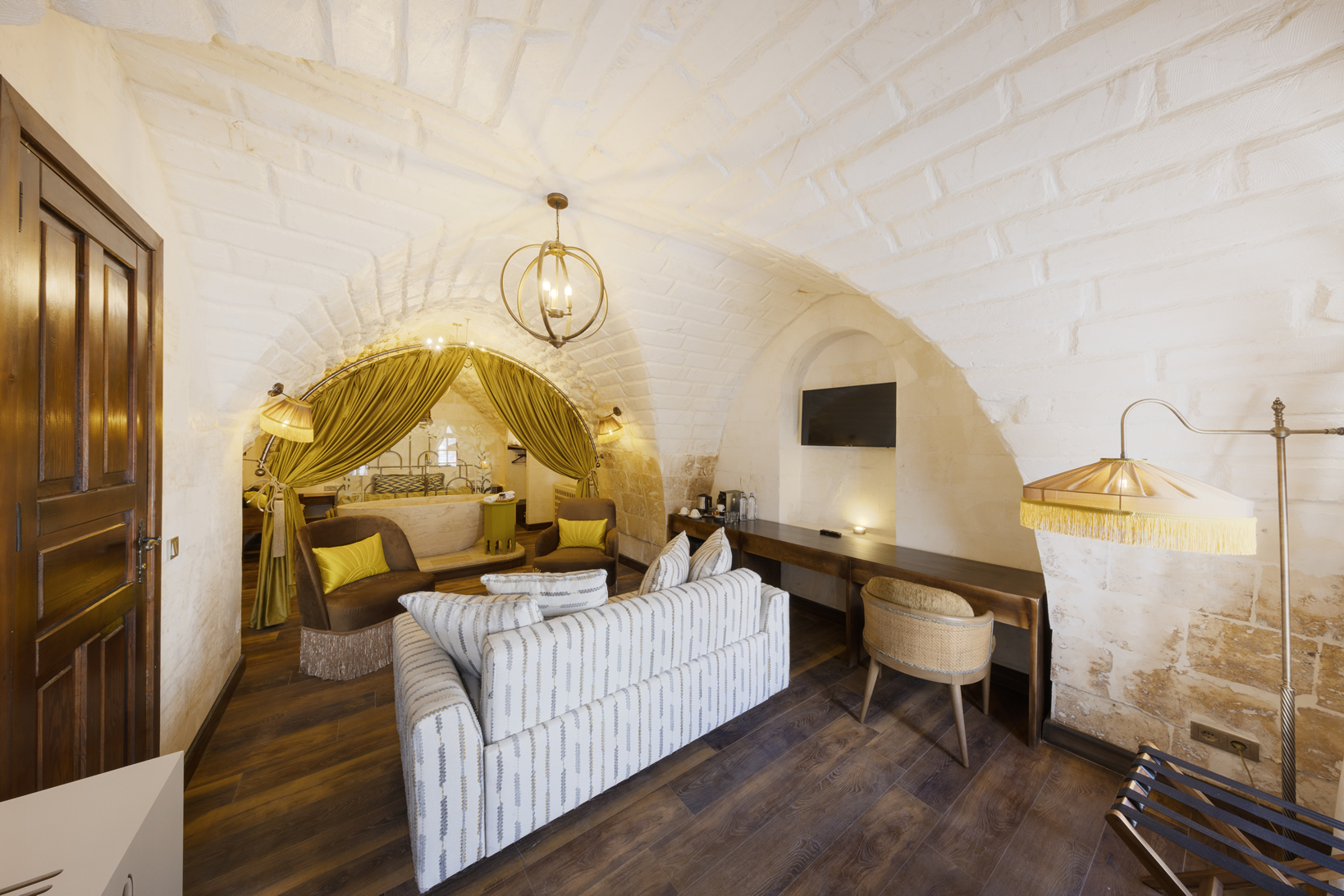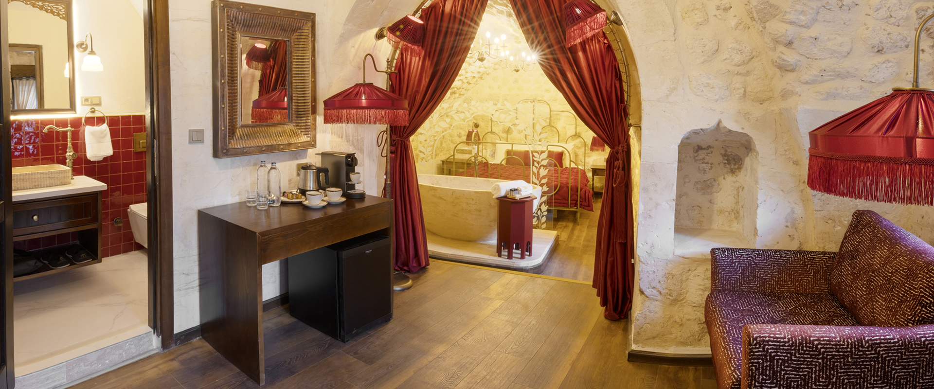Küvetli Suite Odalarımız sadece iki adet ve tamamen size özel bir deneyim sunmak için incelikle tasarlandılar. Urfa’nın yerel motiflerini altına çalan bir hardal rengi ya da yoğun kırmızının hakim olduğu bu odalar geniş ve katmanlı yapısıyla üst düzey bir konfor sunuyor. Duşlu banyoya ek olarak tek parça taştan oyulmuş büyüleyici küvet, Mezopotamya’nın doğal taş işçiliğini banyo ritüeline taşıyor – bu detay, günün yorgunluğunu eritiyor. Minibar, televizyon, ikram cam şişede su, kettle, Nespresso makinesi, Atelier Rebull 1895 banyo serisiyle zenginleşerek lüksü kişiselleştiriyor. Otelin avlularında yer alan bu suitler, Şanlıurfa’nın güzelliğini iç mekan zarafetiyle birleştirerek unutulmaz bir kaçış vadediyor.